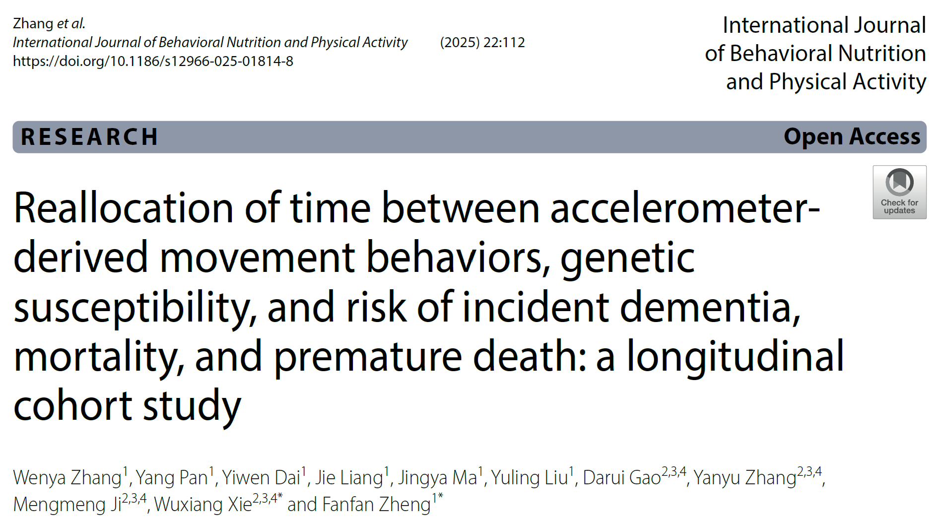米兰体育郑凡凡研究员团队在行为营养学顶刊International Journal of Behavioral Nutrition and Physical Activity(中科院一区Top)上发表了题为《Reallocation of time between accelerometer-derived movement behaviors, genetic susceptibility, and risk of incident dementia, mortality, and premature death: a longitudinal cohort study》的研究论文(DOI: 10.1186/s12966-025-01814-8),首次探讨了24小时内重新分配不同形式的运动行为(包括中重度体力活动、轻度体力活动、静坐和睡眠)与新发痴呆、死亡及过早死亡风险的关联,评估了遗传易感性的潜在交互作用。